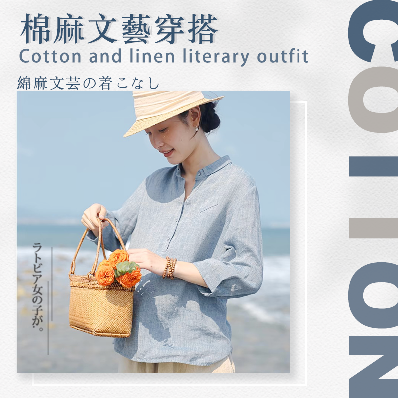 棉麻材質的衣物讓整體穿搭既符合春夏季節的需求,又能保持一份淡雅的文藝氣息。