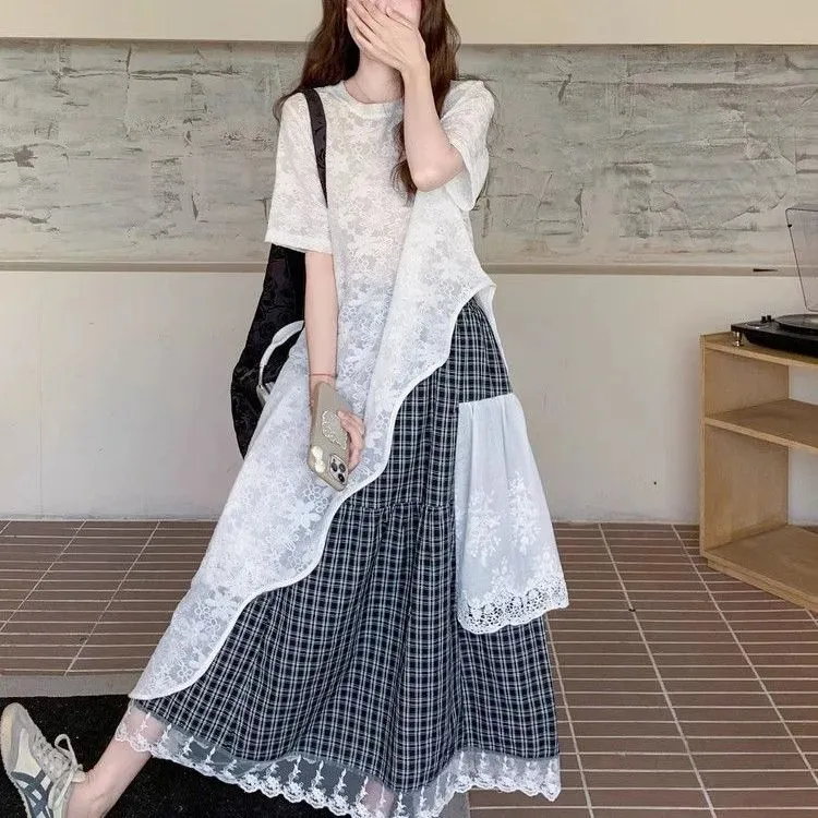 【單件/套裝】假兩件掛脖長袖T恤+高腰格紋闊腿褲兩件套裝