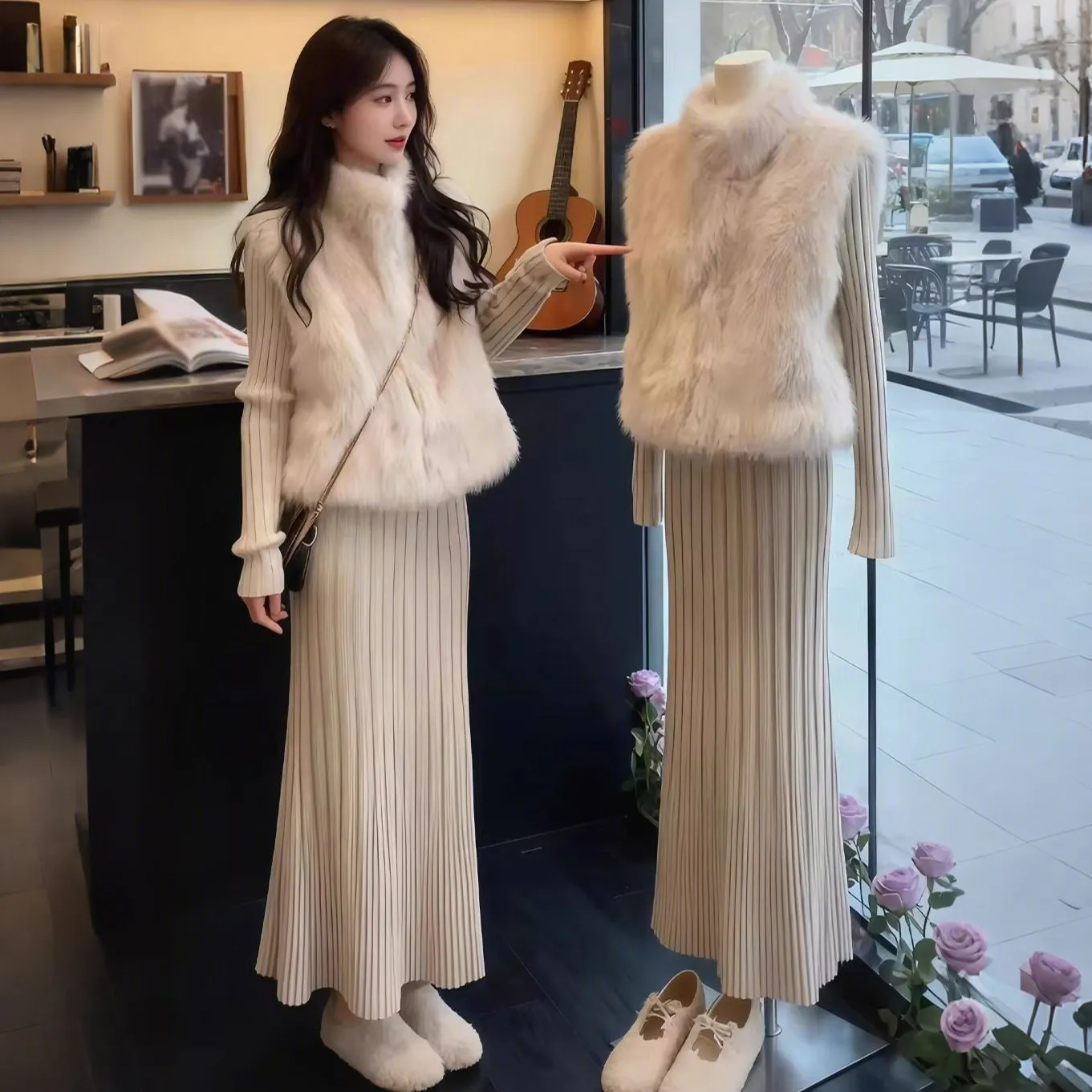 【單件/套裝】百搭顯瘦毛馬甲+針織洋裝兩件套裝
