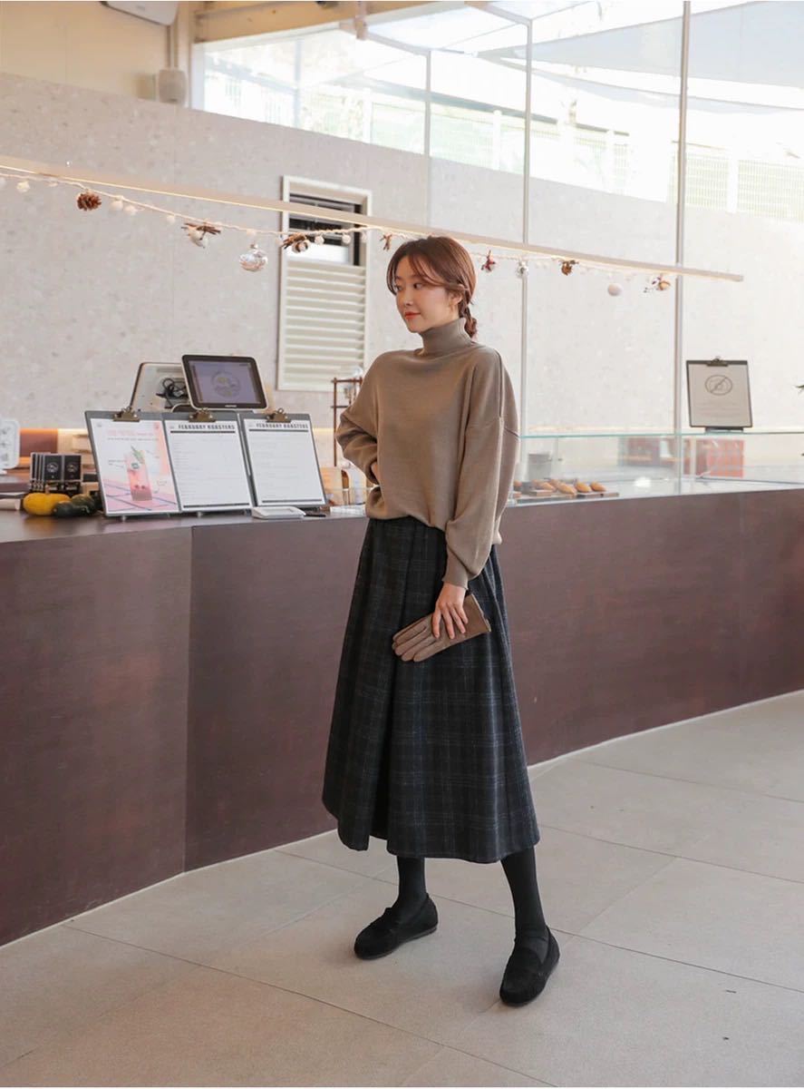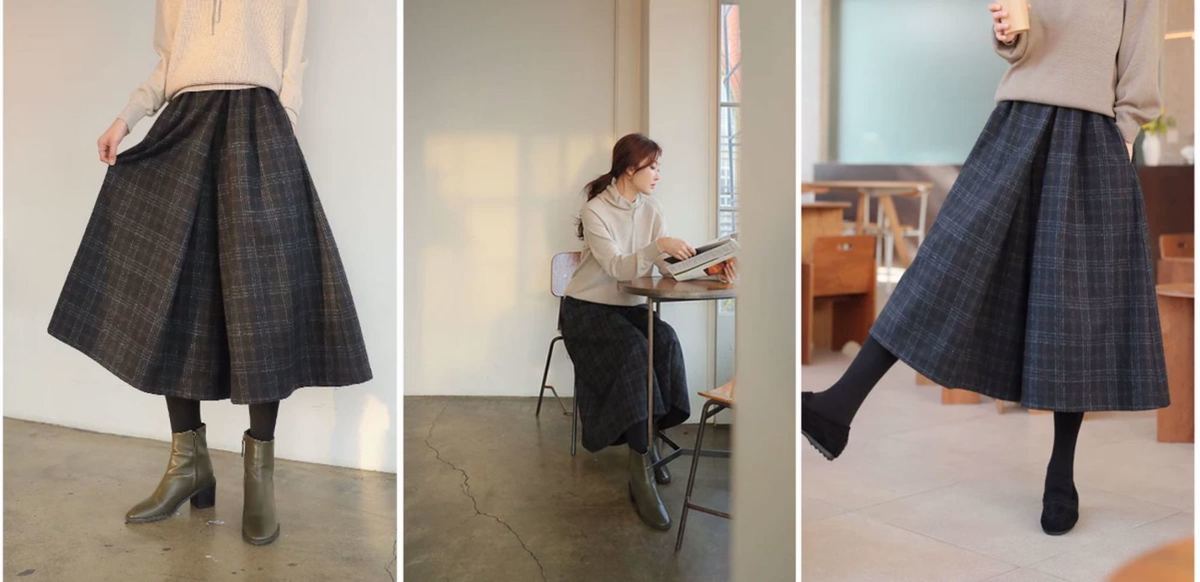 寬鬆顯瘦鬆緊腰格子毛呢闊腿褲裝