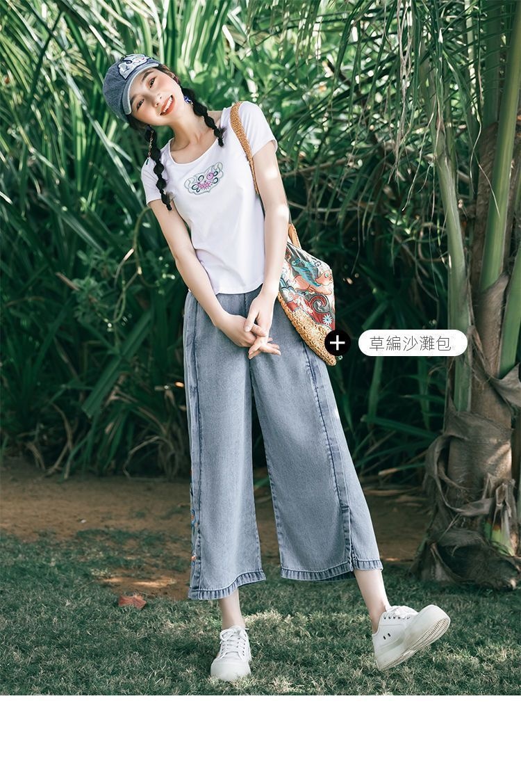 民族風刺繡薄款寬鬆a字型鬆緊腰七分牛仔褲