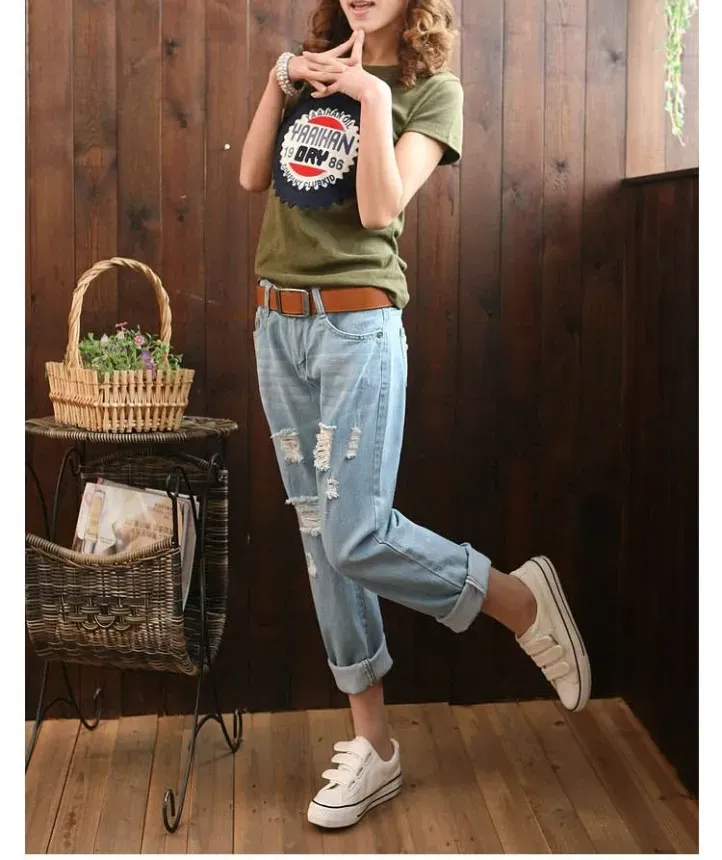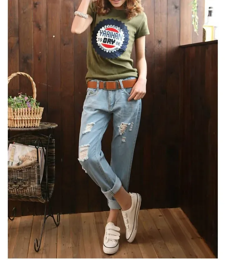 顯瘦寬鬆破洞鬆緊腰休閒哈褲倫九分牛仔褲