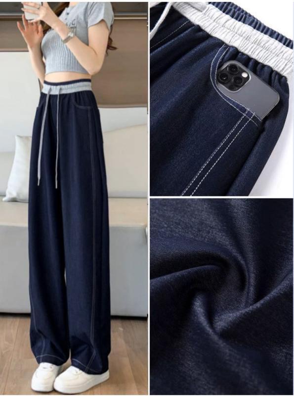 高腰寬鬆顯瘦垂感休閒拼接牛仔拖地闊腿褲