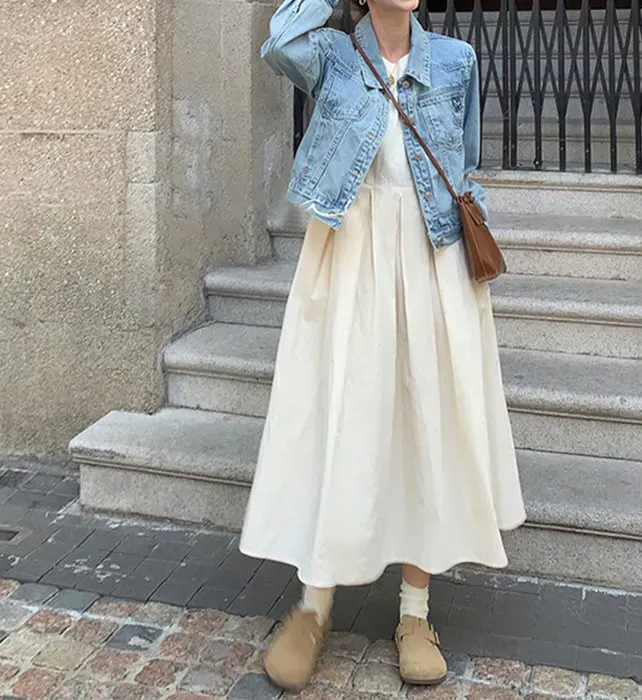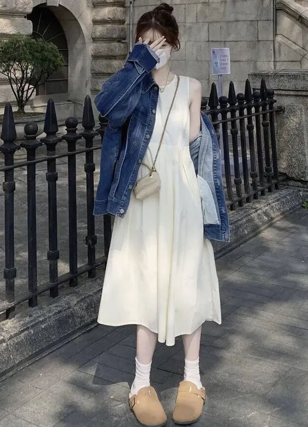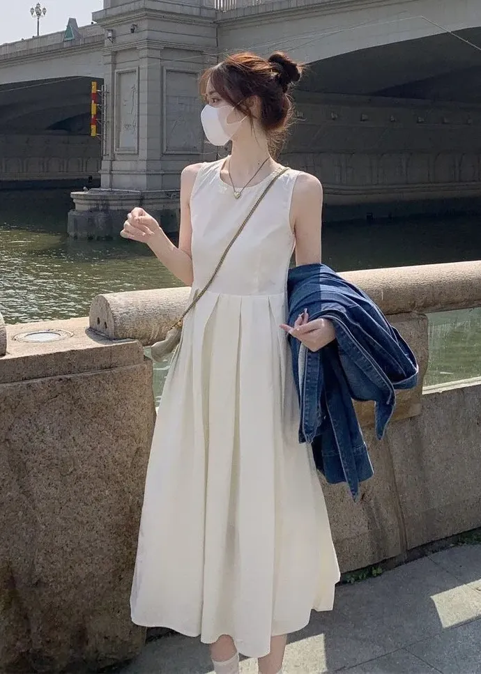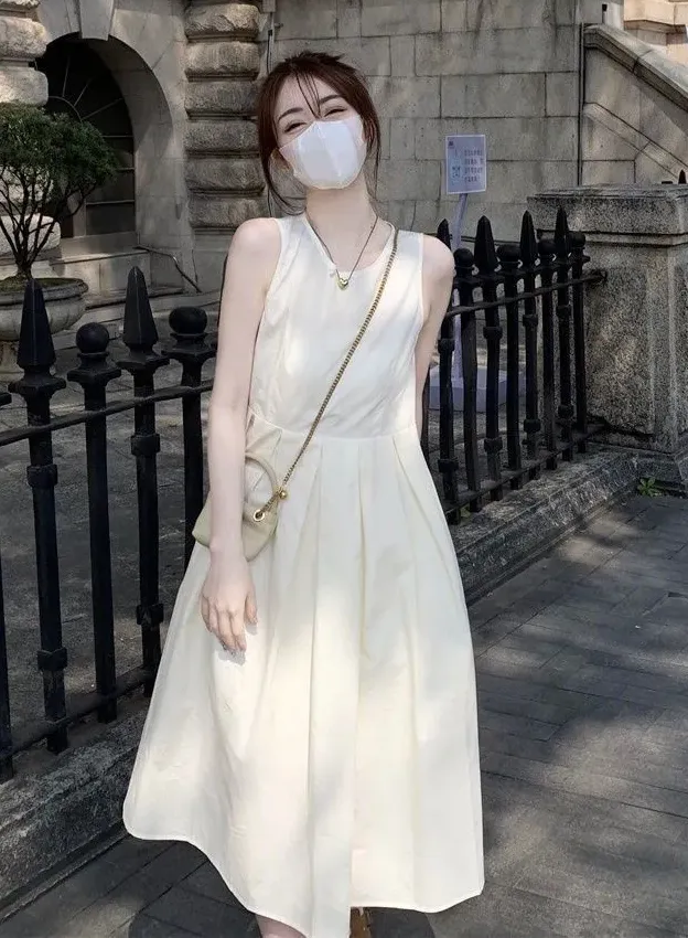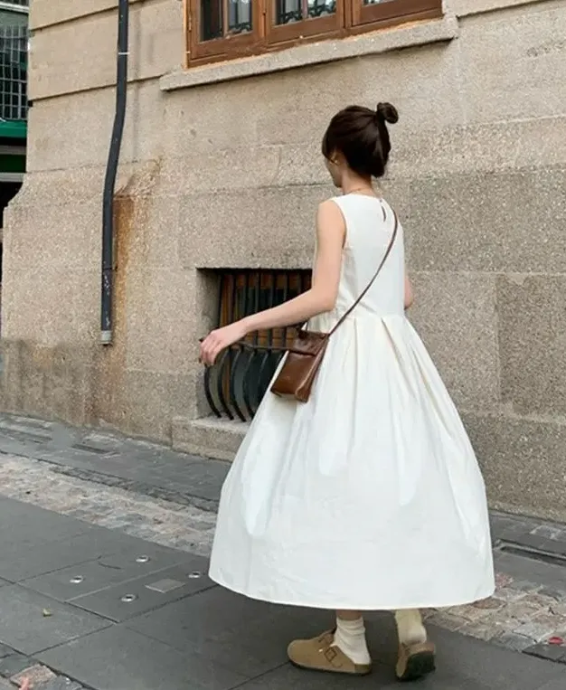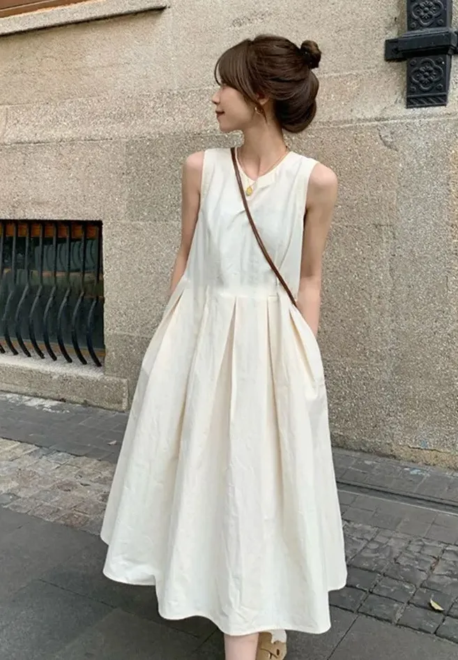 法式收腰顯瘦中長款蓬蓬大擺無袖洋裝