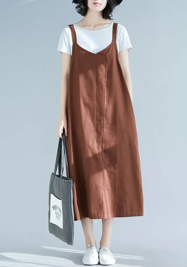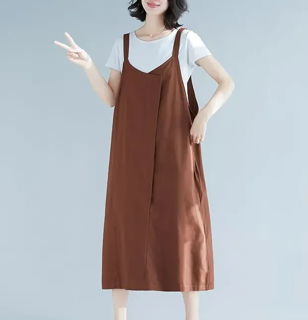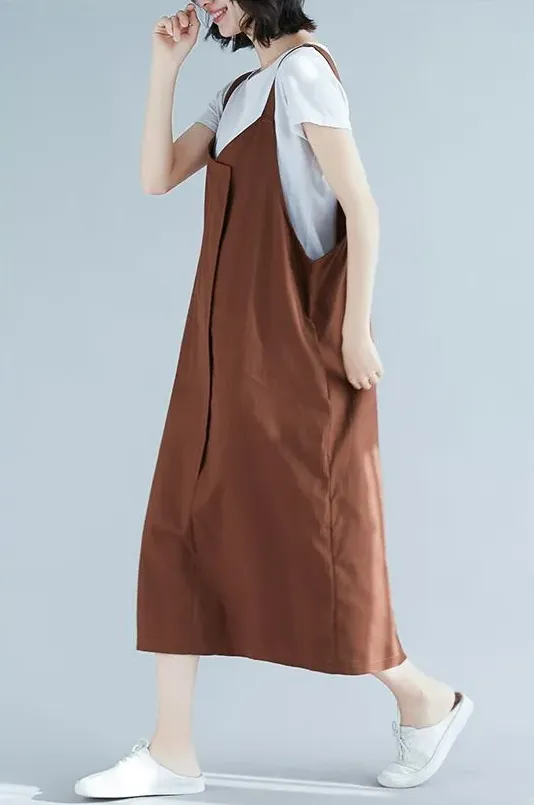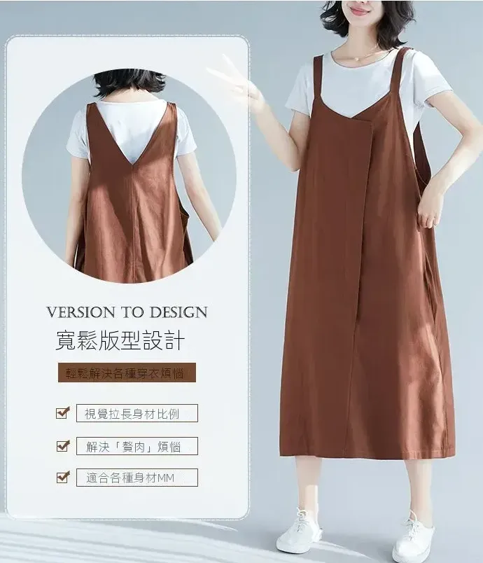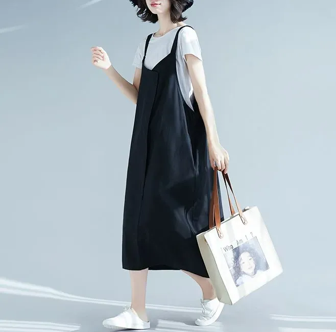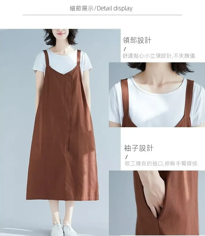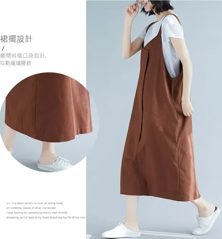 韓版休閒寬鬆棉麻中長款無袖吊帶洋裝