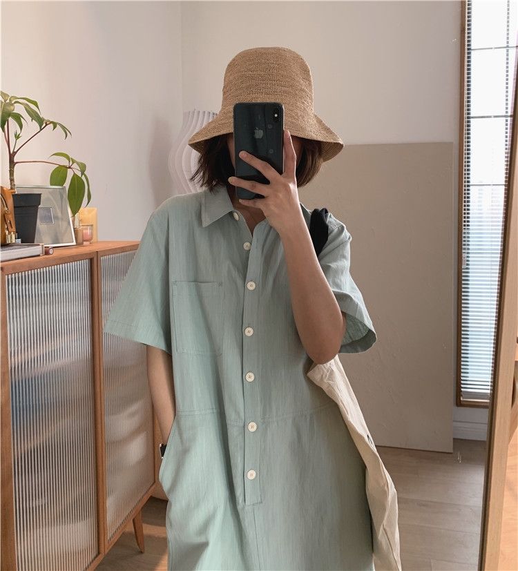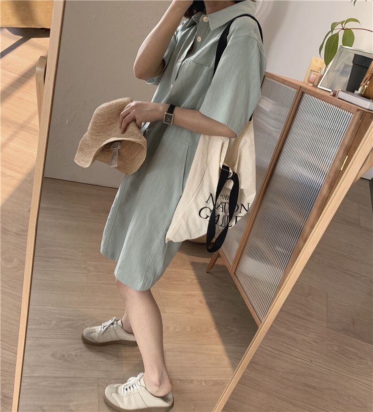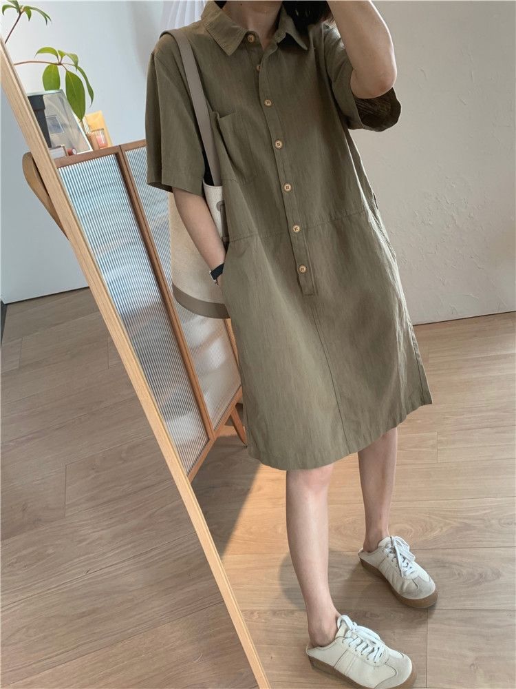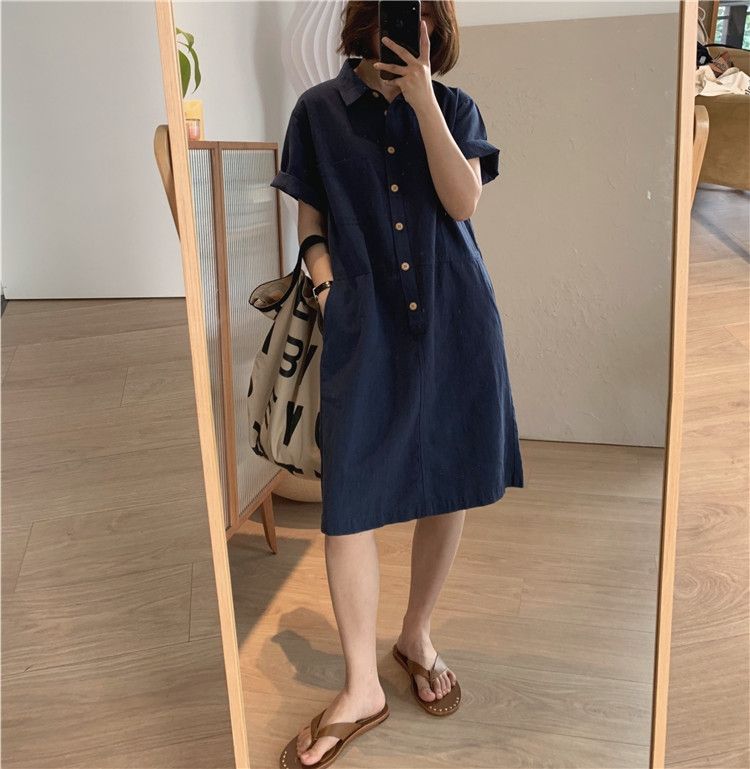 棉麻涼爽簡約休閒直筒翻領套頭短袖洋裝