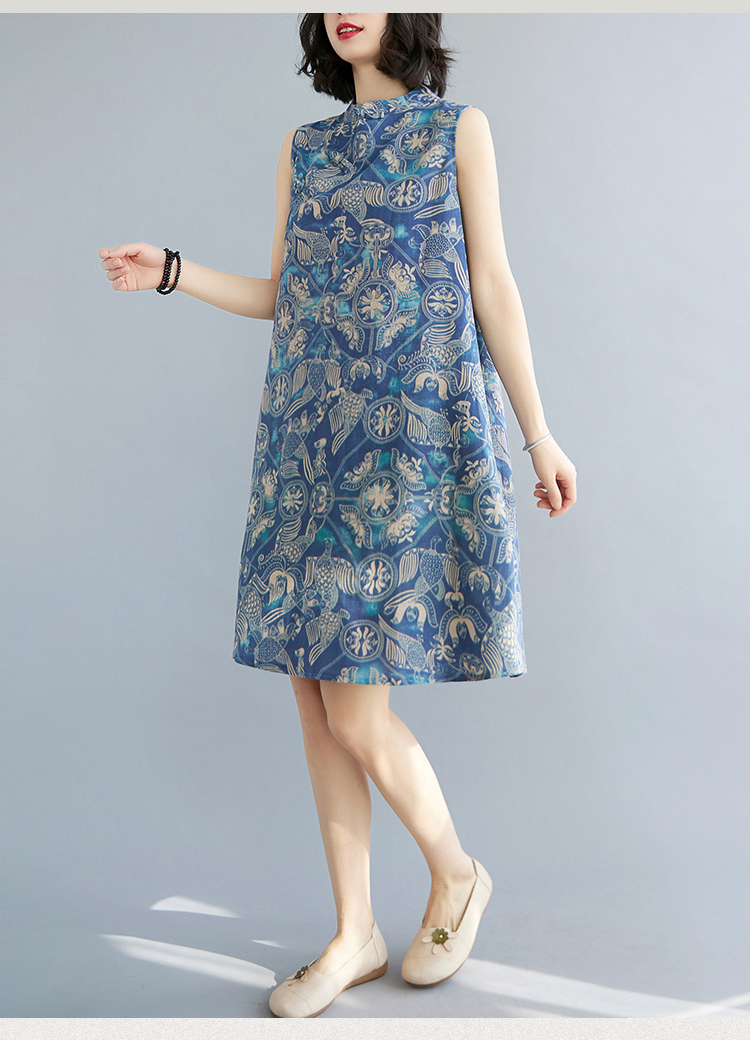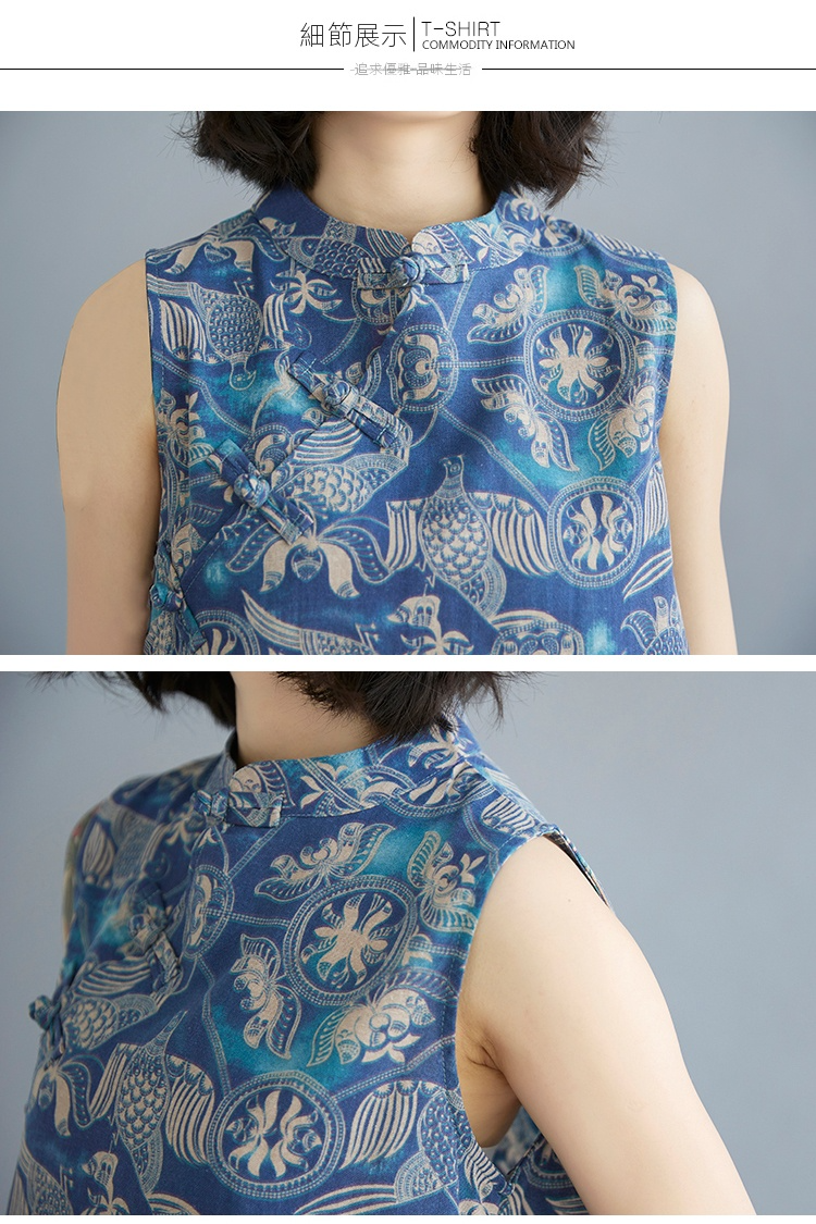 中式顯瘦棉麻印花復古改良盤扣旗袍洋裝