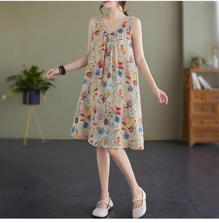 碎花大碼寬鬆遮肚棉麻A字圓領無袖洋裝