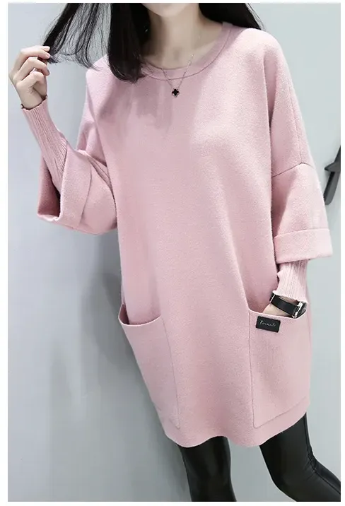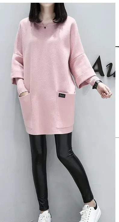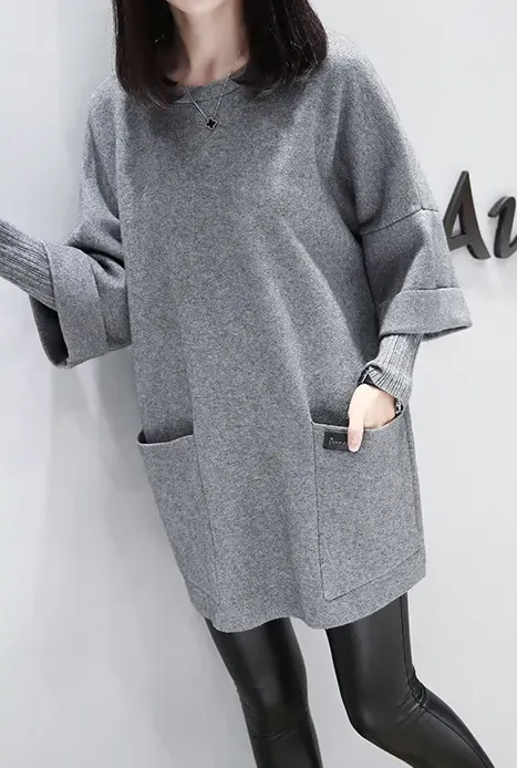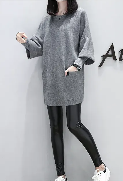 休閒寬鬆拼接長袖素色長款圓領長袖