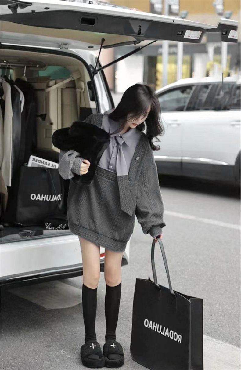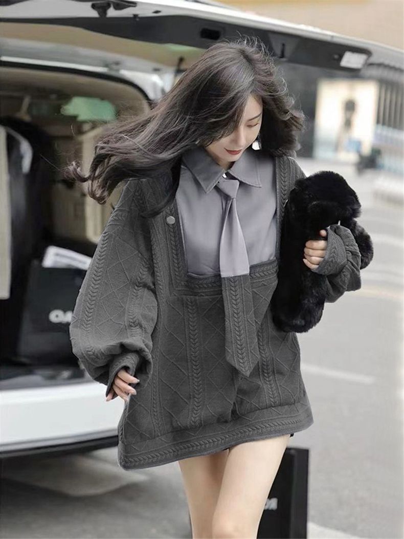 假兩件灰色慵懶風POLO領外穿設計感領帶長袖