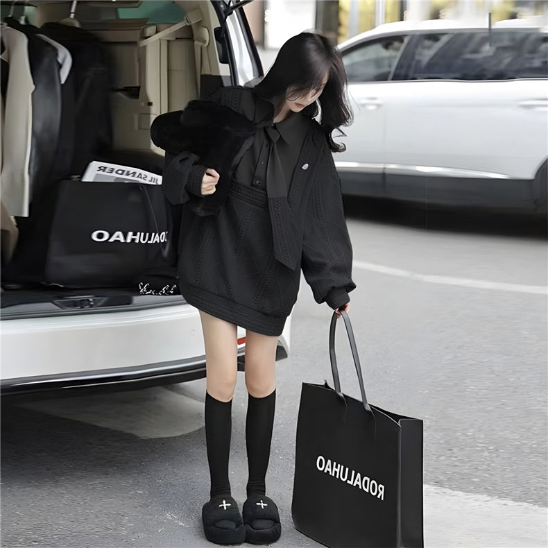 【單件/套裝】寬鬆圓領系帶針織毛衣+百搭吊帶裙兩件套