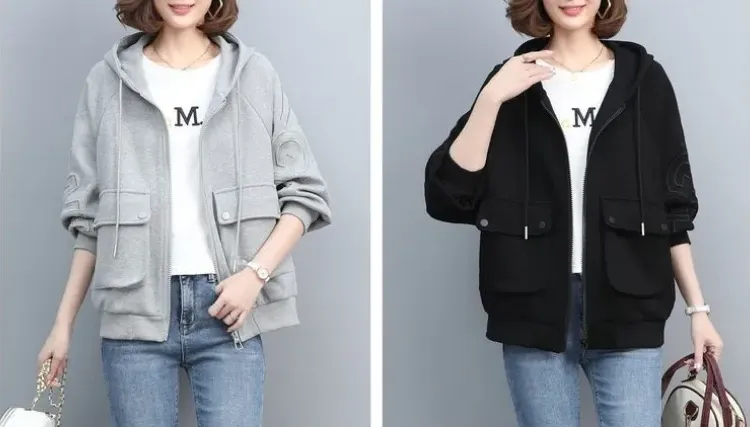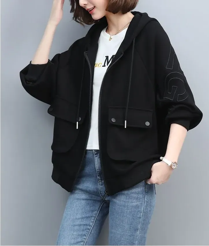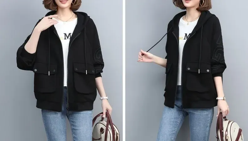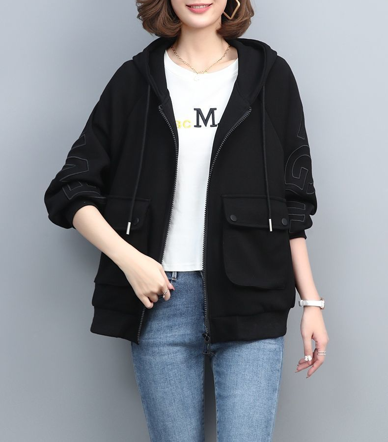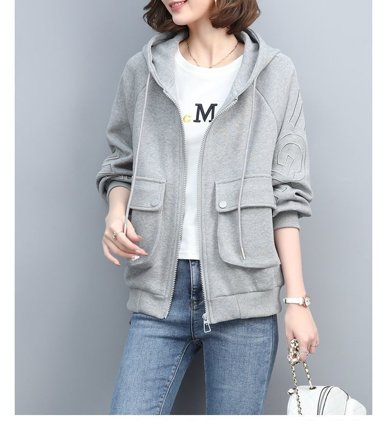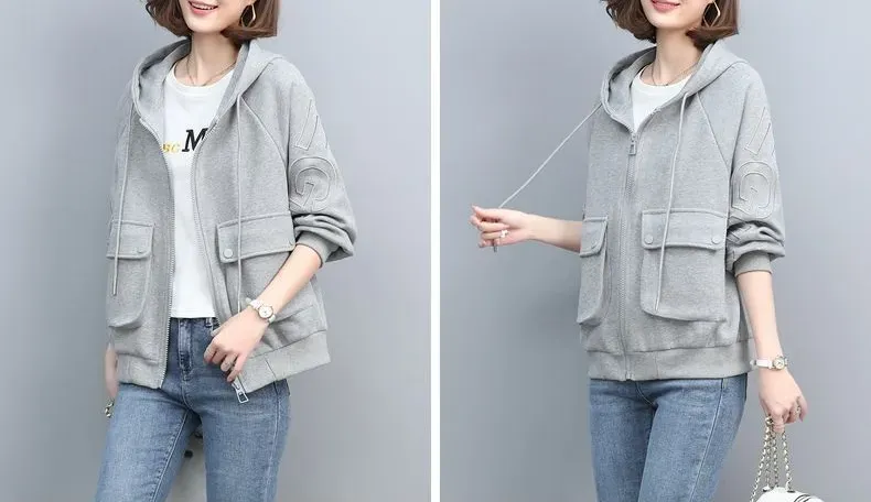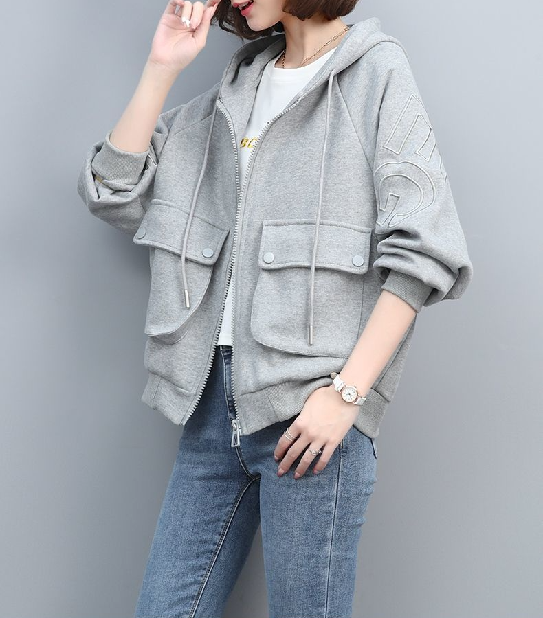 韓版寬鬆休閒口袋連帽拉鍊短款開衫