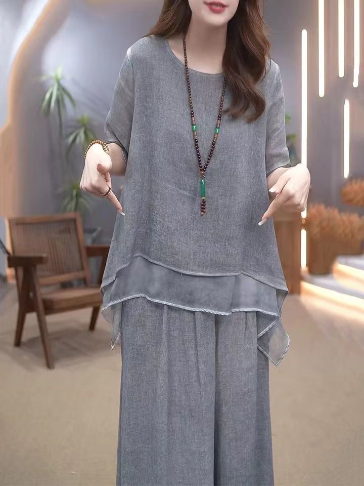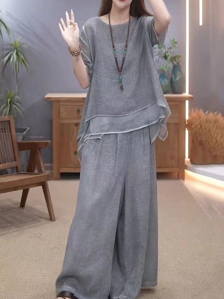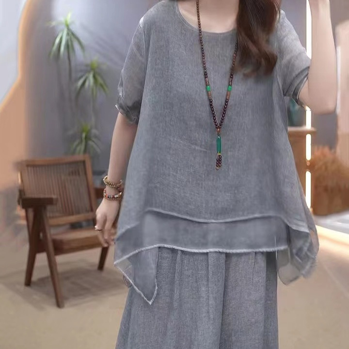 【整套】復古文藝棉麻不規則下擺上衣+闊腿褲兩件套裝