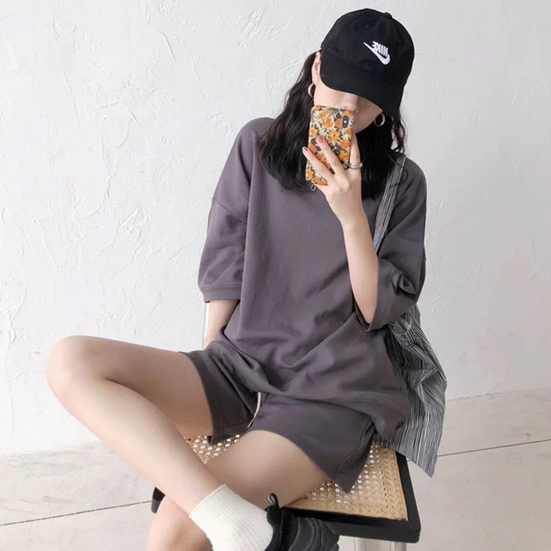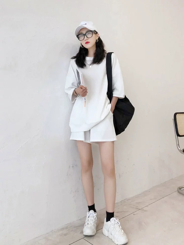 【整套】韓版素色寬松連帽短袖+百搭休閑褲兩件套