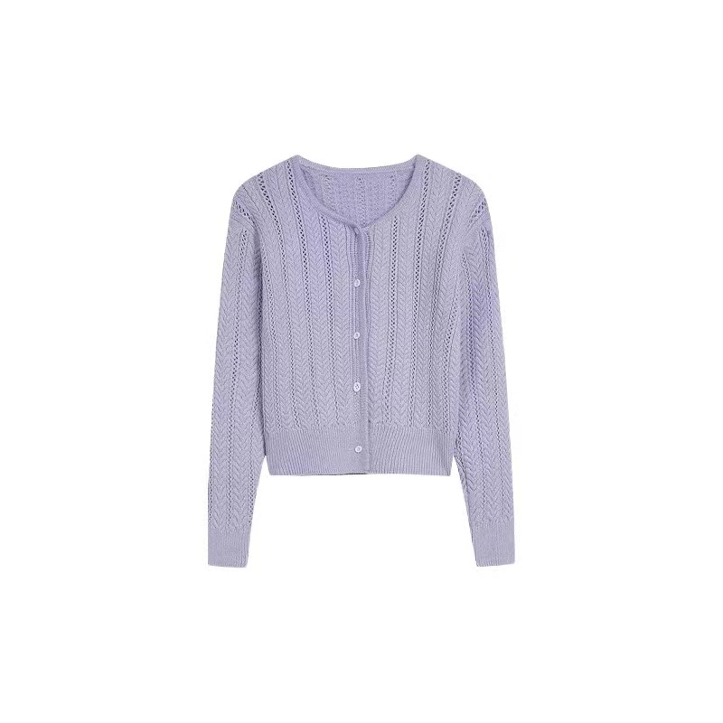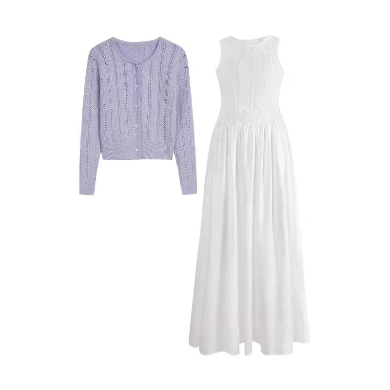 【單件/整套】氣質溫柔風紫色針織開衫+鏤空白色洋裝兩件套裝