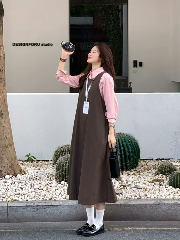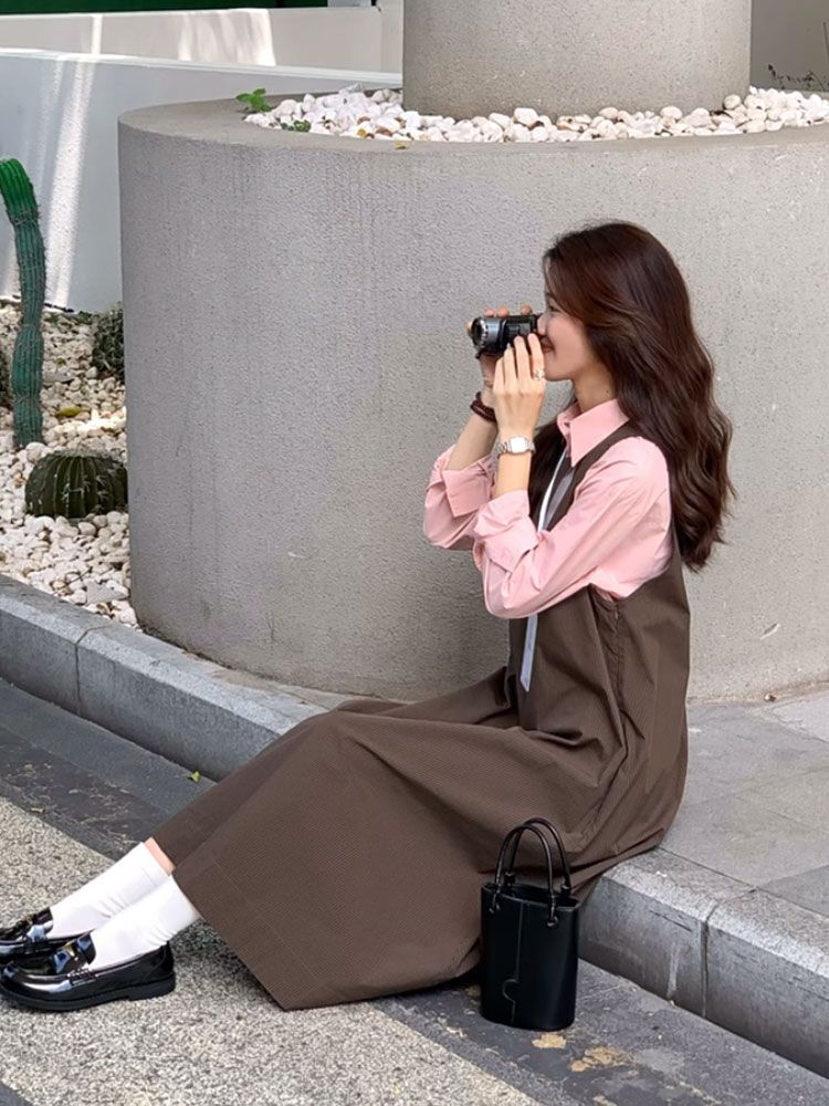 【兩件套】百搭長袖襯衫+背帶長裙