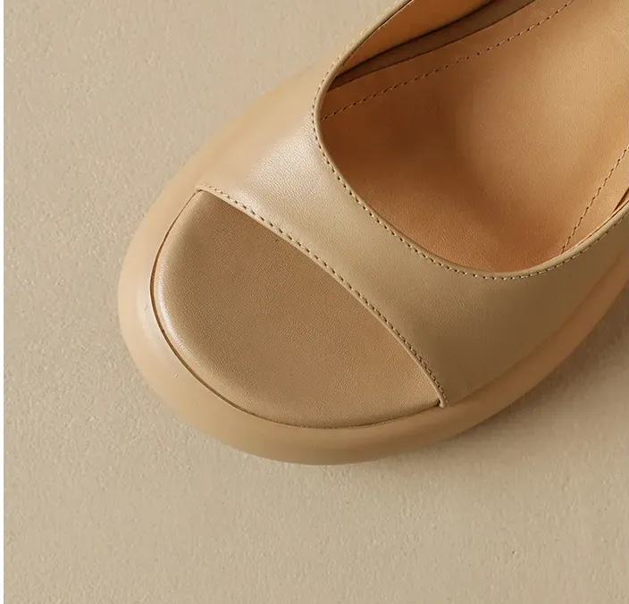 非侈Feichi 巨好看~真皮圆头厚底露趾凉鞋女2023夏休闲百搭粗跟鞋
