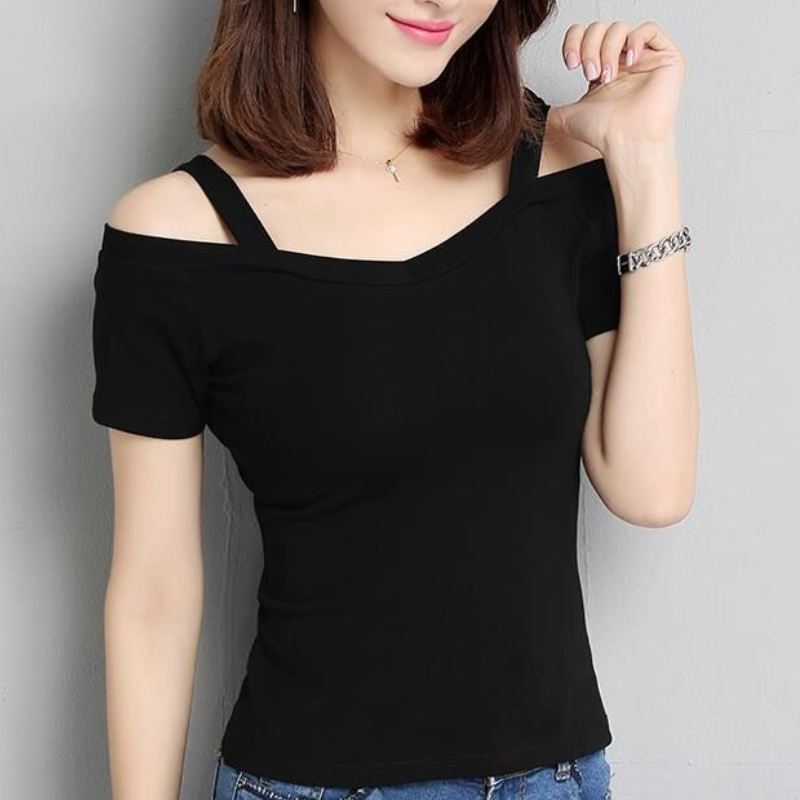 T恤女2022夏季韩版黑色l露肩吊带短袖T恤女一字领露肩性感上衣潮