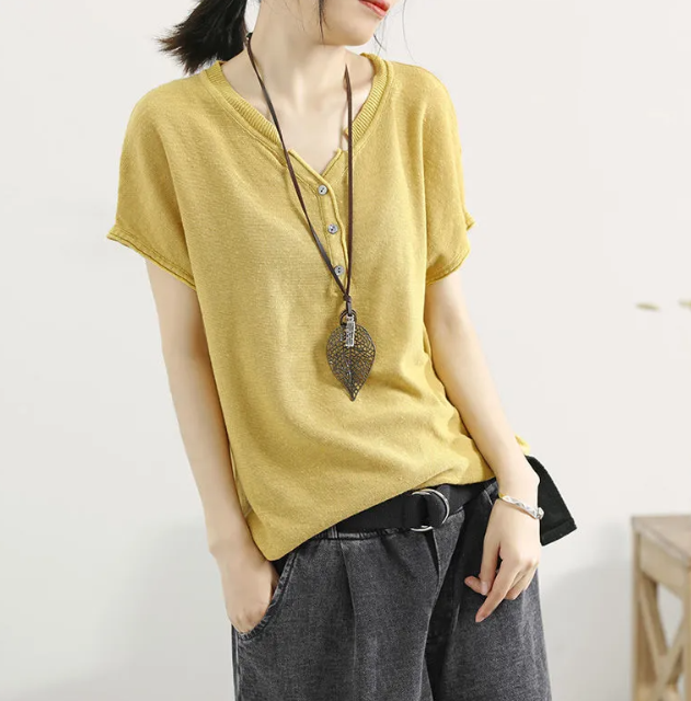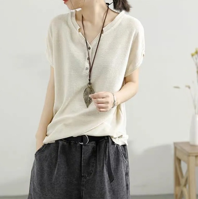 冰絲針織V領韓版套頭薄款打底寬鬆短袖