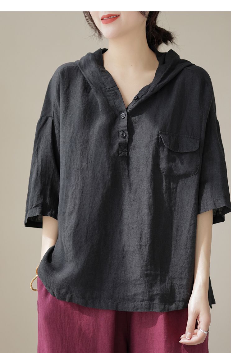文藝簡約寬鬆顯瘦棉麻透氣連帽短袖