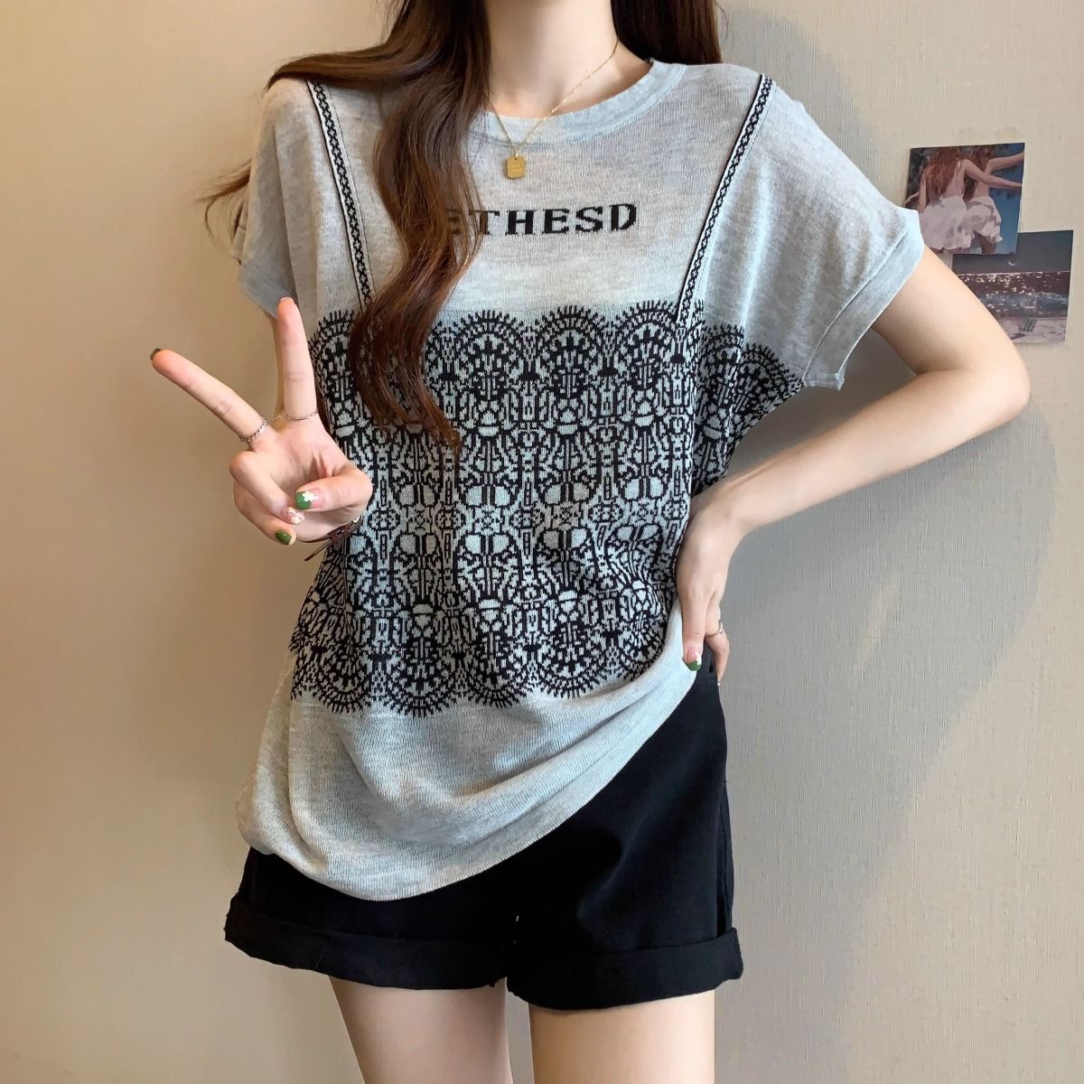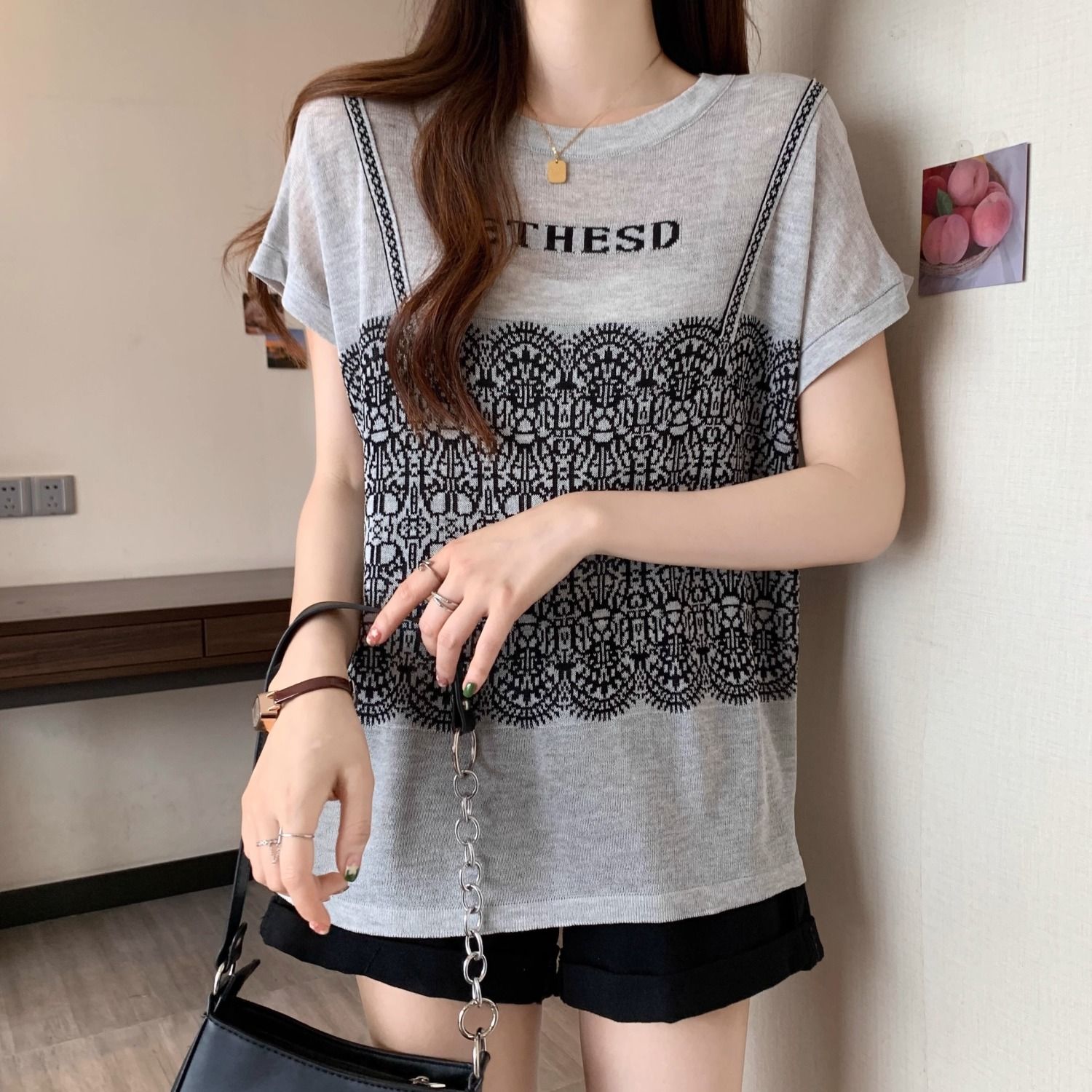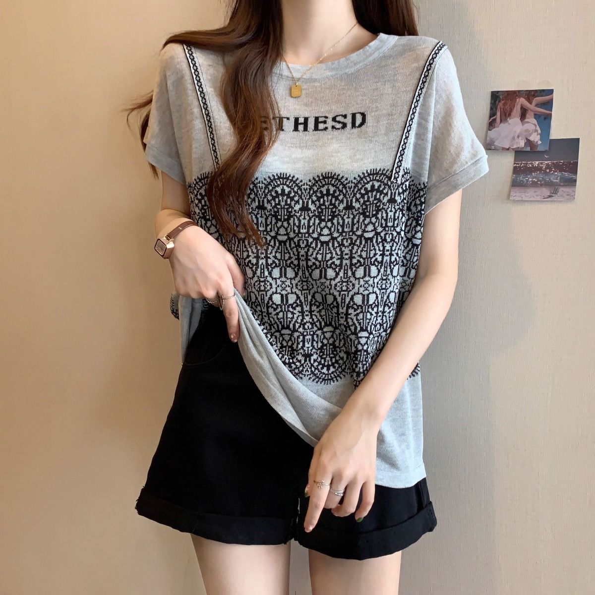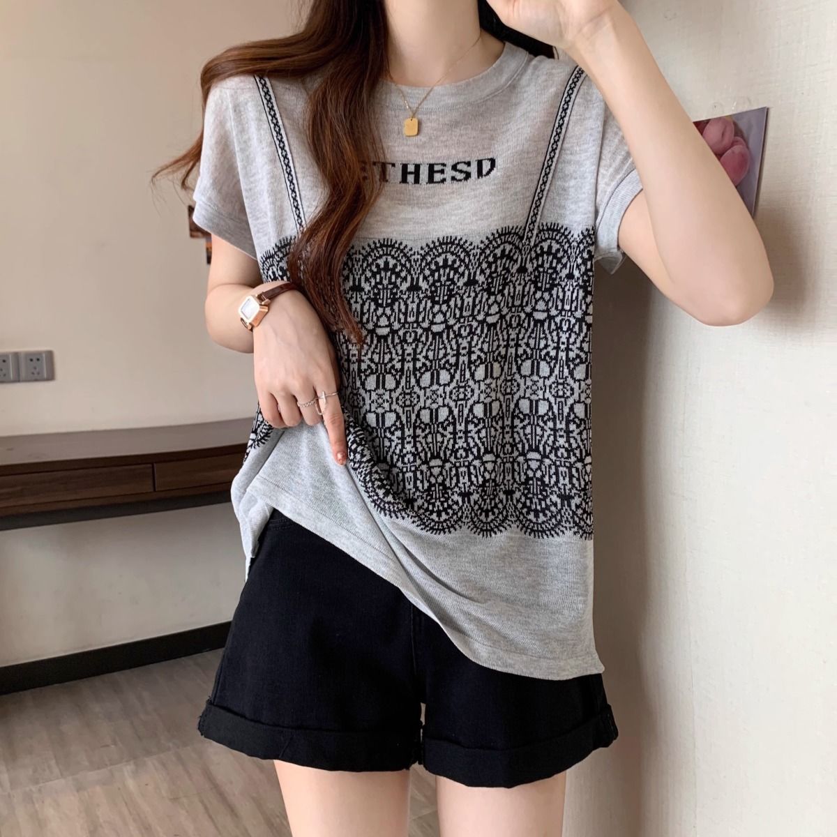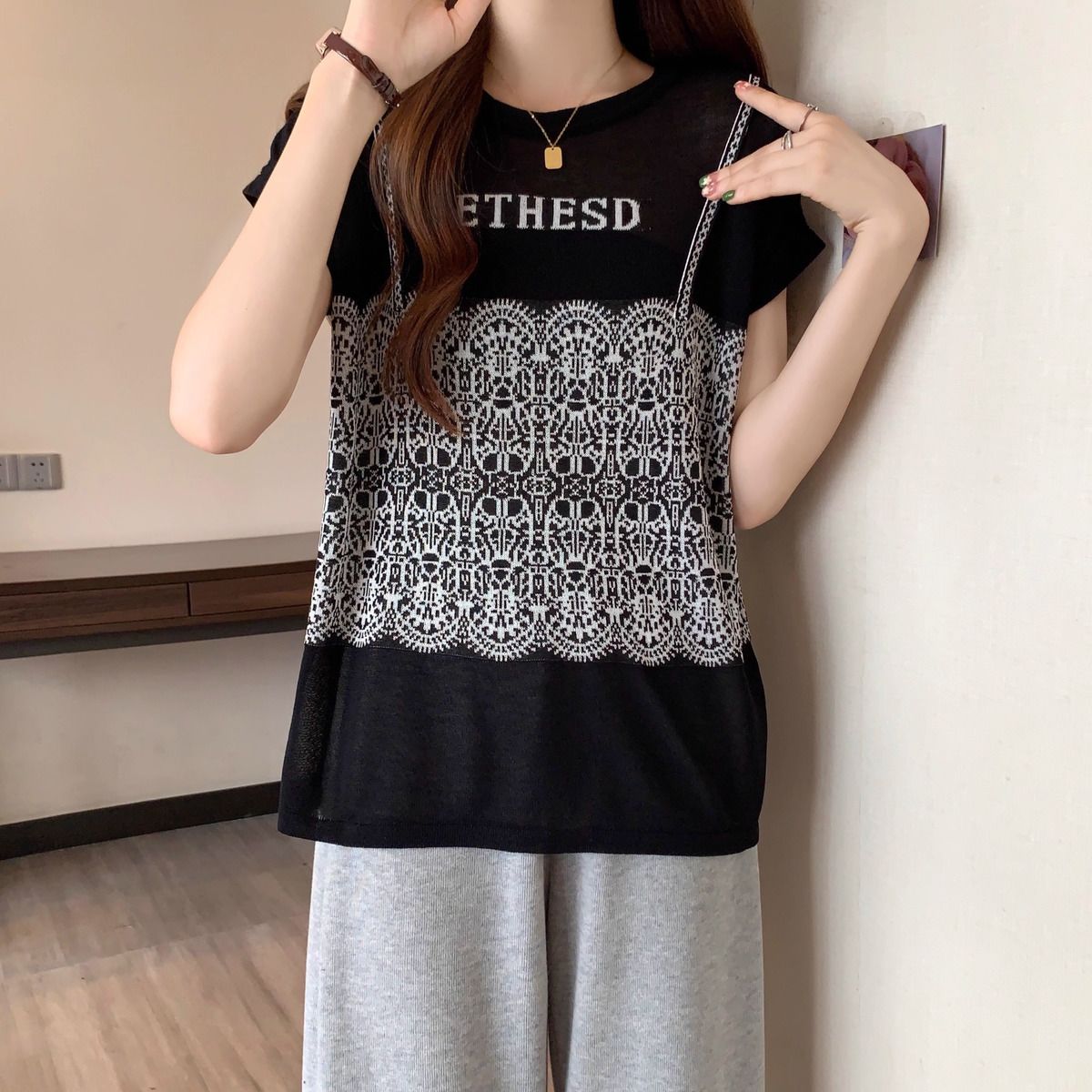 法式假兩件冰絲針織蕾絲拼接短袖t恤