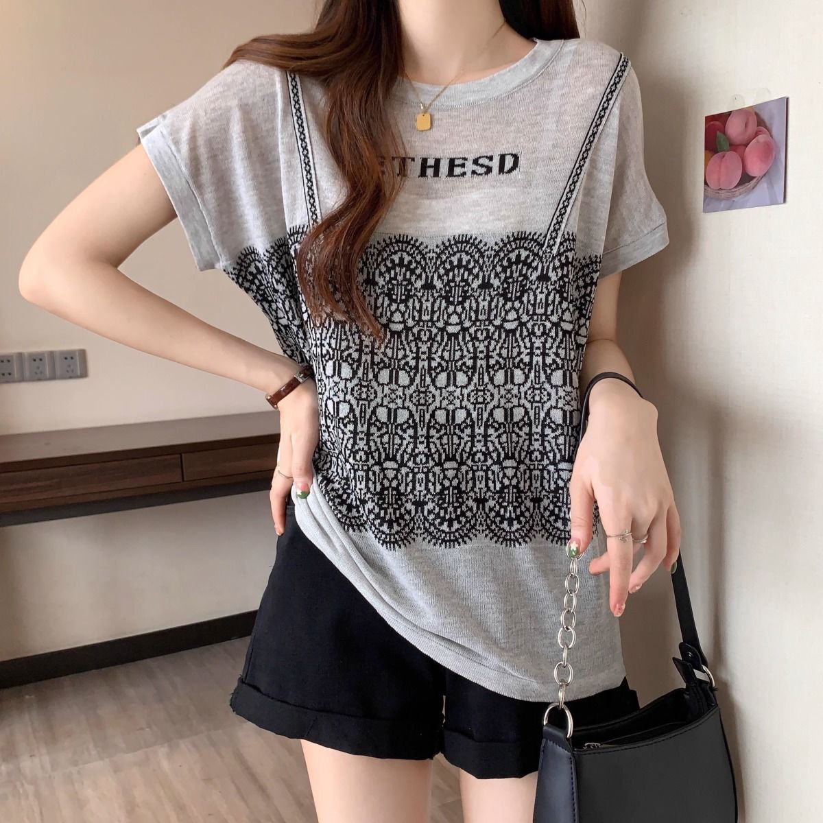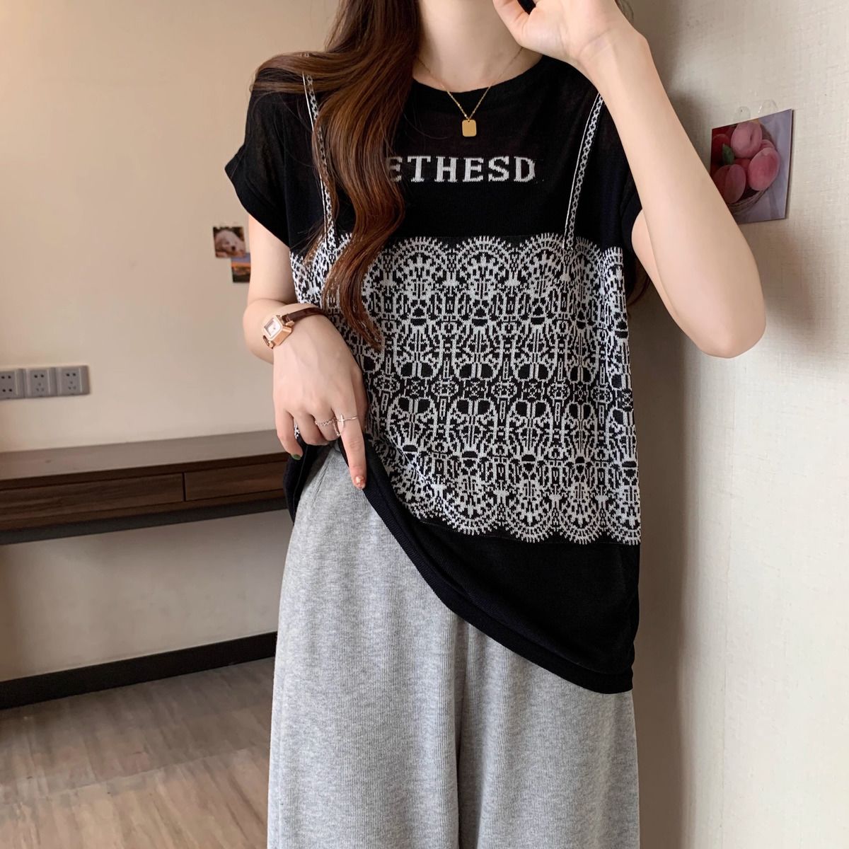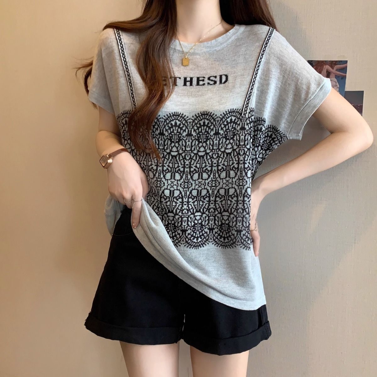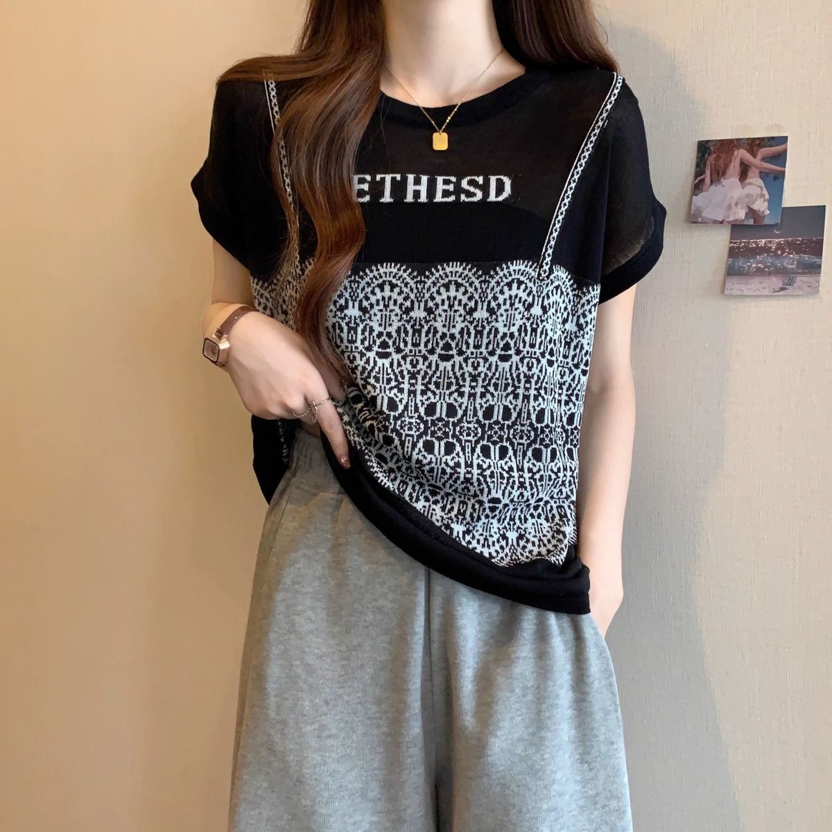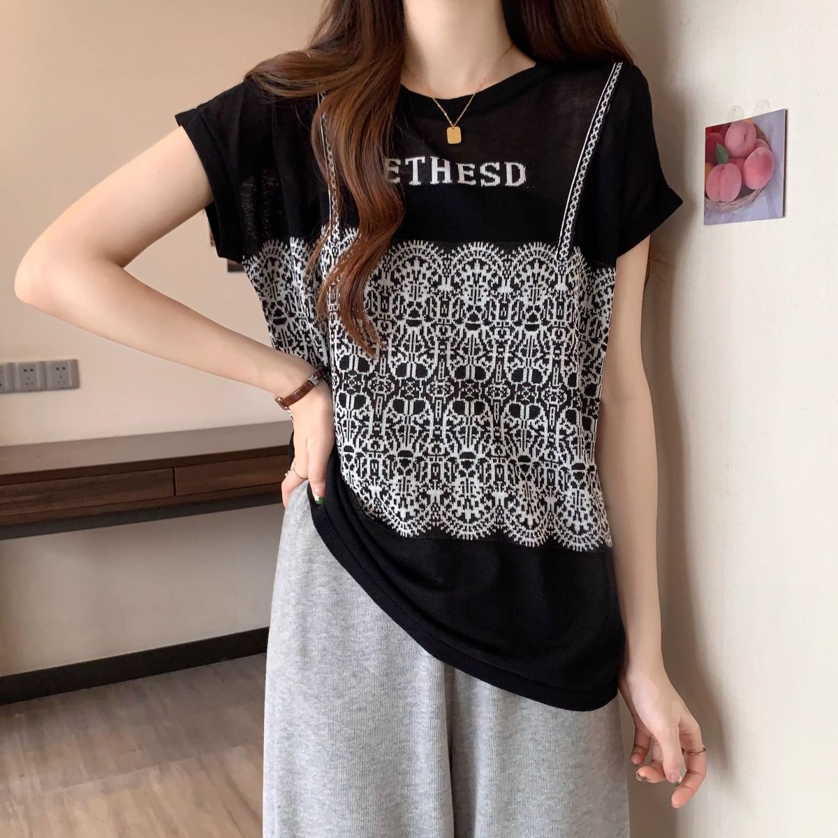 法式假兩件冰絲針織蕾絲拼接短袖t恤